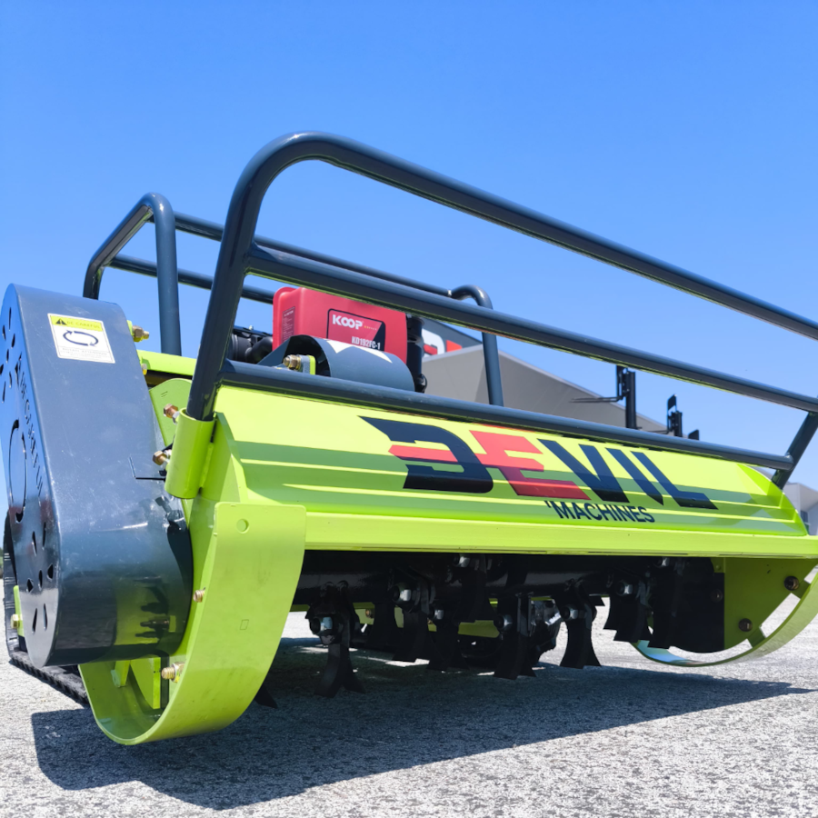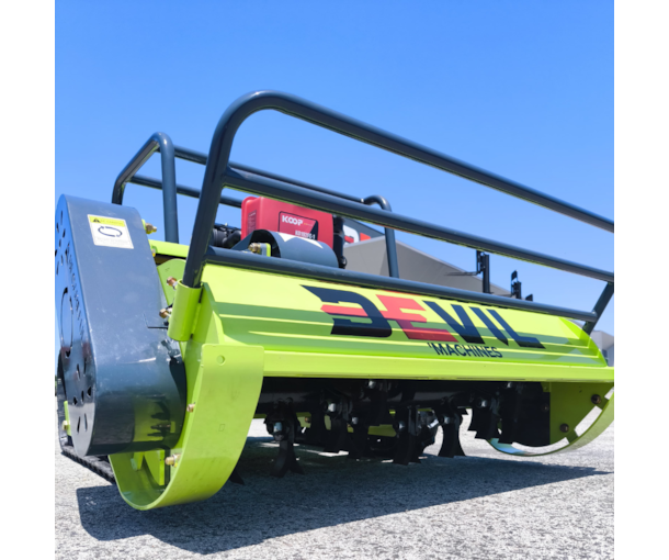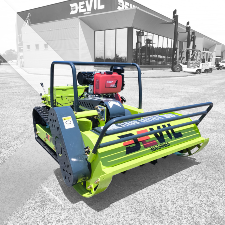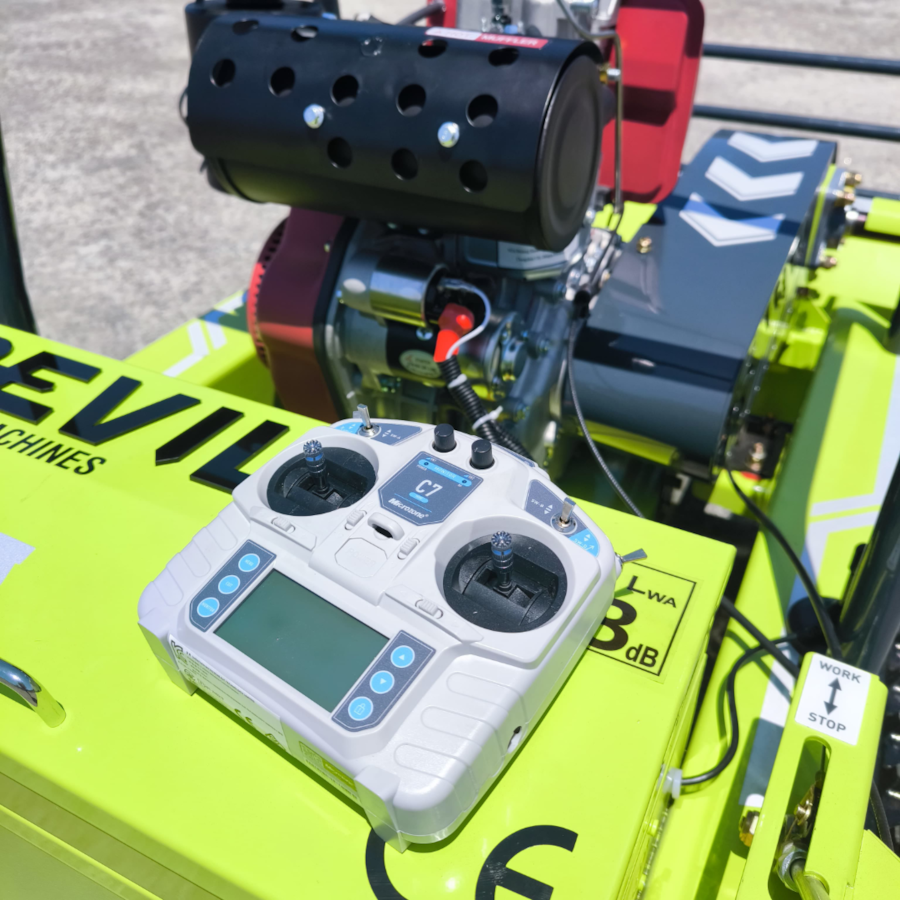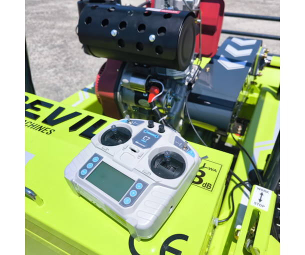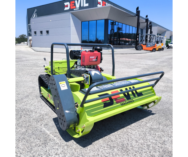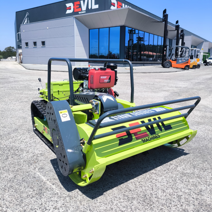 Robot destroçador de mato a gasóleo, comandado por controlo remoto, ideal para a limpeza e manutenção de terrenos não cultivados. Equipado com arranque elétrico e facas em Y penduradas, proporciona um corte eficiente de vegetação rasteira com altura ajustável entre 20mm e 200 mm. As lagartas garantem excelente tracção e estabilidade, permitindo trabalhar com segurança e precisão em terrenos irregulares, inclinados ou de difícil acesso.