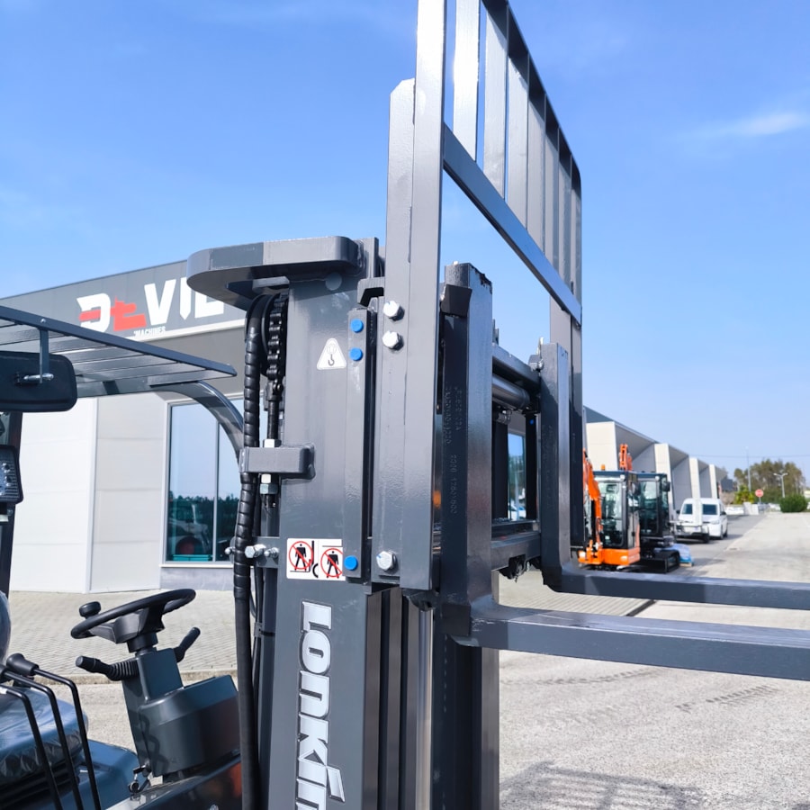 Empilhador profissional, com bateria de lítio, para manuseamento fácil de cargas pesadas. Mastro triplex resistente, com as roldanas laterais para maior visibilidade geral. Capacidade de carga de 2500 kg.