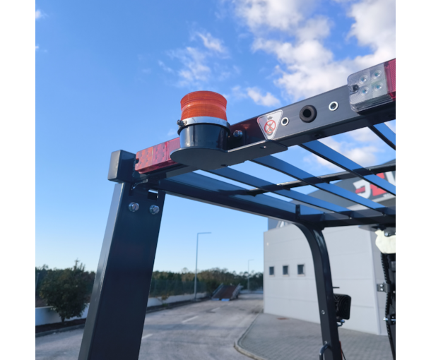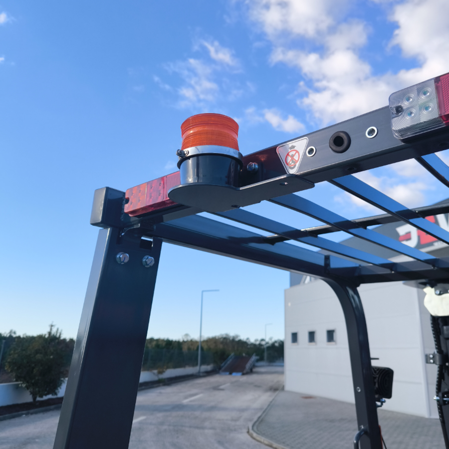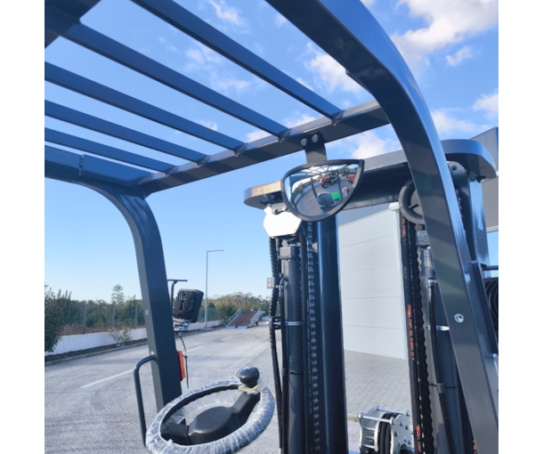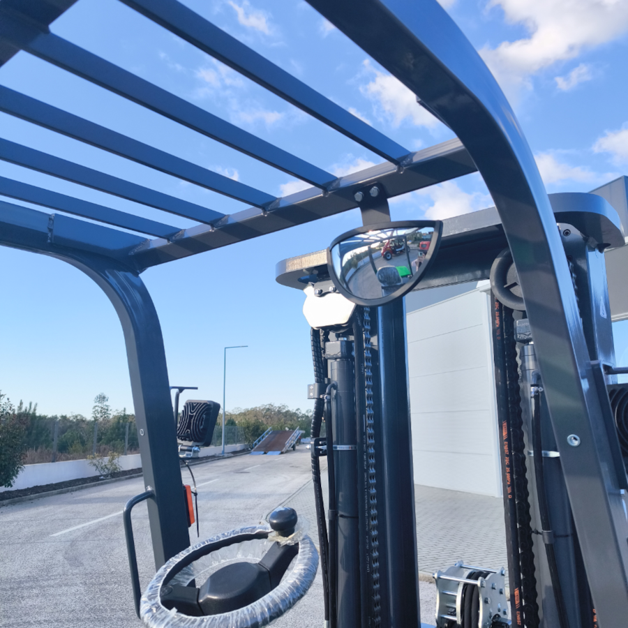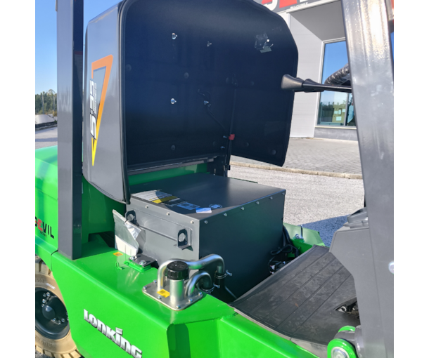 Empilhador profissional, com bateria de lítio, para manuseamento fácil de cargas pesadas. Mastro triplex resistente, com as roldanas laterais para maior visibilidade geral. Capacidade de carga de 3500 kg.