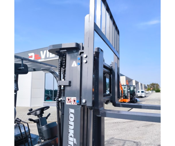 Empilhador profissional, com bateria de lítio, para manuseamento fácil de cargas pesadas. Mastro triplex resistente, com as roldanas laterais para maior visibilidade geral. Capacidade de carga de 2500 kg.